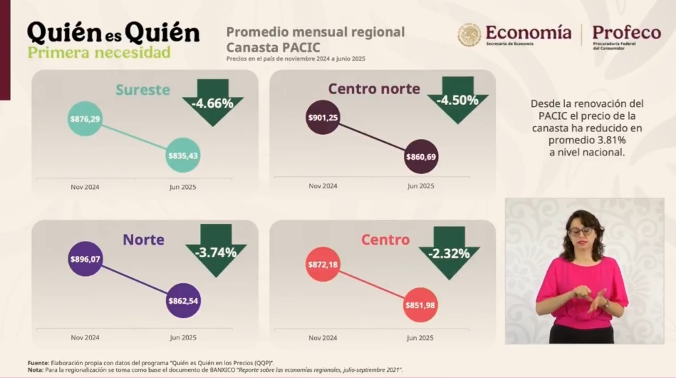 “Destacar que de la primera renovación del PACIC, dirigida por la Presidenta en noviembre de 2024 a junio 2025, a nivel nacional hay una baja del 3.81% del precio de esta canasta, lo cual es el reflejo del esfuerzo y seguimiento que hacen varias instituciones y tiendas de autoservicio para poder tener estos precios”, señaló.