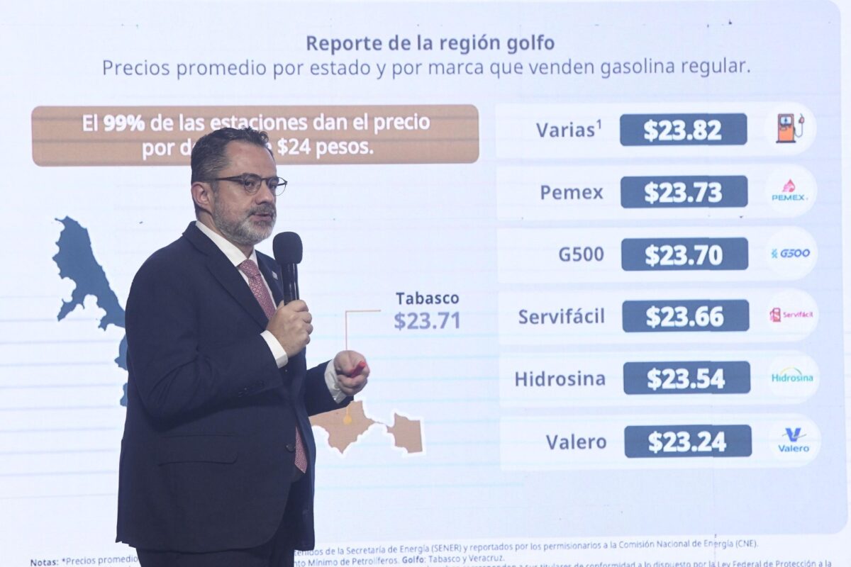 Dio a conocer que en esta región el 99% de las estaciones de servicio comercializan el litro del combustible en menos de $24 pesos. En Veracruz el precio promedio es de $23.75 pesos y en Tabasco de $23.71.