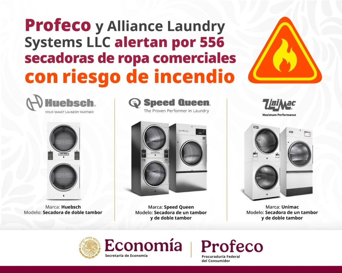 La Procuraduría Federal del Consumidor (Profeco) y Alliance Laundry Systems LLC alertan del llamado a revisión para las secadoras de ropa comerciales de las marcas Huebsch, modelo secadora de doble tambor; marca Speed Queen, modelo secadora de un tambor y de doble tambor; y marca Unimac, modelo secadora de un tambor y de doble tambor.
