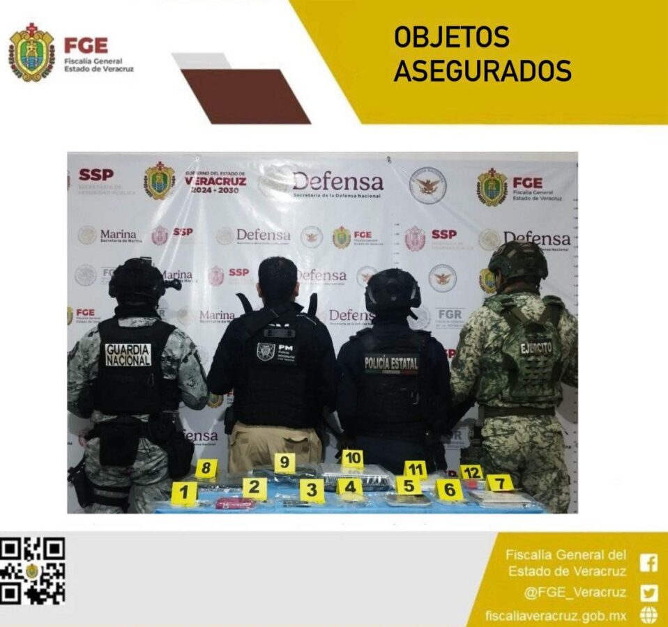 En dicho operativo se aseguraron bolsas herméticas con una leyenda alusiva a un grupo delictivo, una báscula gramera, un cartucho balístico, una libreta conteniendo una lista con nombres y cantidades, una fornitura y laptops.