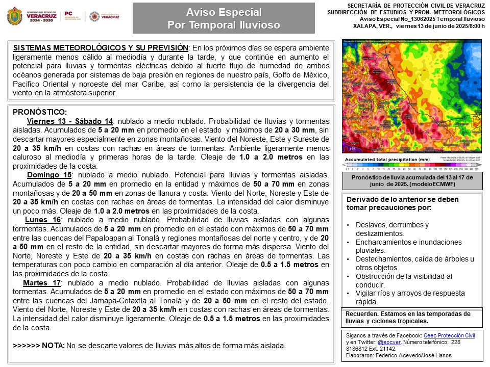 Martes 17: nublado a medio nublado. Probabilidad de lluvias aisladas con algunas tormentas. Acumulados de 5 a 20 mm en promedio en el estado con máximos de 50 a 70 mm entre las cuencas del Jamapa-Cotaxtla al Tonalá y de 20 a 50 mm en el resto del estado. Viento del Norte, Noreste y Este de 20 a 35 km/h en costas con rachas en áreas de tormentas. La intensidad del calor disminuye ligeramente. Oleaje de 0.5 a 1.5 metros en las proximidades de la costa.