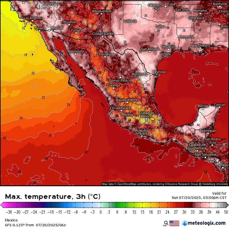 En las siguientes 24 horas persistirá el potencial de lluvias gran parte del país, excepto la Península de Baja California, norte de Coahuila, Nuevo León y Tamaulipas donde la probabilidad será baja, mientras que los acumulados más importantes se prevén a lo largo de regiones del montaña de Sonora, Chihuahua, Durango y Zacatecas, también se preven acumulados relevantes en Nayarit, Jalisco, Aguascalientes, Guanajuato, Querétaro, sureste de San Luis Potosí, Estado y Ciudad de México, Tlaxcala, Hidalgo, Morelos, Colima, norte y occidente de Puebla, Michoacán, Guerrero, norte y noreste de Oaxaca, región montañosa y cuencas del sur de Veracruz. Por otra parte, se prevé un gradual aumento de los valores de la temperatura máxima, con los valores más altos en Baja California, oeste y sur de Sonora, llanuras y costa de Sinaloa, norte de Chihuahua y Coahuila, norte y centro de Nuevo León y Tamaulipas, Tabasco, Campeche, Yucatán y Quintana Roo. En tanto, las temperaturas mínimas mostrarán poco cambio o disminuyen ligeramente especialmente en los estados del centro del país, los valores más bajos en regiones montañosas de Chihuahua, Durango, Zacatecas, oriente de Jalisco, occidente de San Luis Potosí, Aguascalientes, Guanajuato, Querétaro, estado de México, Tlaxcala y región montañosa de Puebla y Veracruz.