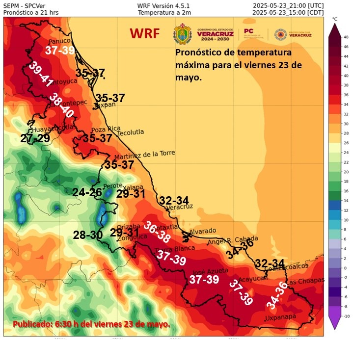 Costa y llanura del centro: Despejado a medio nublado durante el día; los nublados aumentan por la noche y madrugada con probabilidad de lluvias dispersas y ligeras. Acumulados en 24 horas menores de 5 mm. Viento del norte y noreste de 20 a 35 km/h. La intensidad del calor con poco cambio en comparación al día de ayer, ambiente templado por la noche y madrugada. Tmáx 36 a 38°C en llanura y de 32 a 34 °C en costa. Tmín. 25 a 28°C.