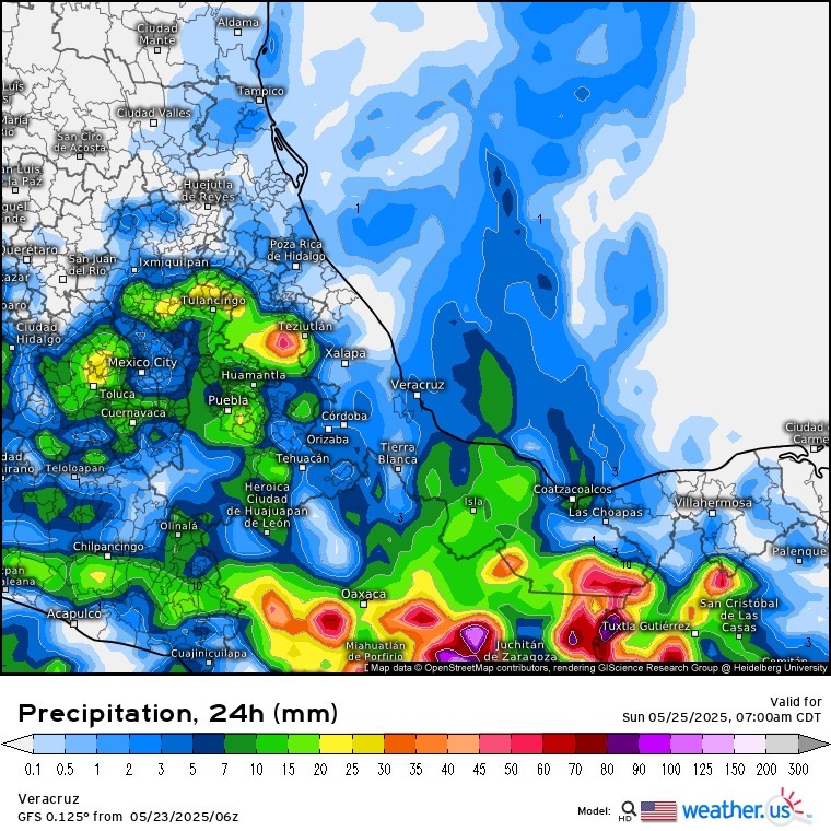 En las siguientes 24 horas, el potencial de lluvias y tormentas disminuye en el noreste y aumenta en el centro y sur del país, así como en algunos sectores del sureste, con los máximos acumulados en Michoacán, sur de Jalisco, Guerrero, Estado de México, Ciudad de México, Tlaxcala, norte de Puebla, centro-sur de Oaxaca y Chiapas. En relación con la temperatura máxima, se espera poco cambio con respecto al día anterior, con los valores más altos en Sonora, Sinaloa, Nayarit, Michoacán, norte y costas de Guerrero, costas y este de Oaxaca, Chiapas, Chihuahua, Coahuila, norte-centro de Nuevo León, Tamaulipas, sureste de San Luis Potosí, Veracruz, Tabasco y entidades de la Península de Yucatán.