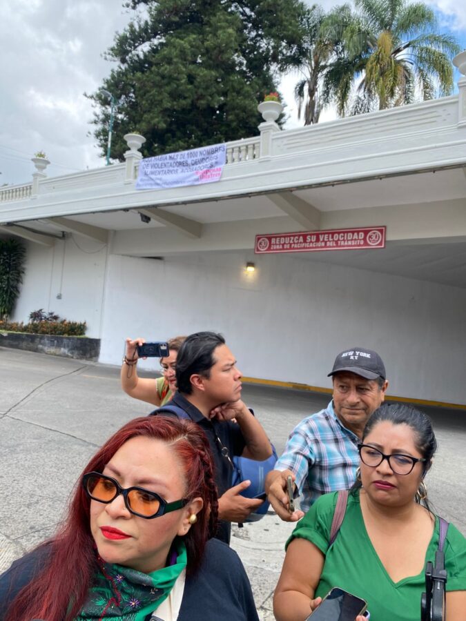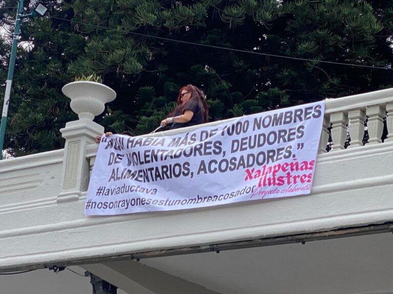 Colocan manta en entrada al viaducto de Xalapa; donde recuerdan que hubo nombres de hombres violentadores; la colocó la activista Wendy López de la colectiva Xalapeñas Ilustres