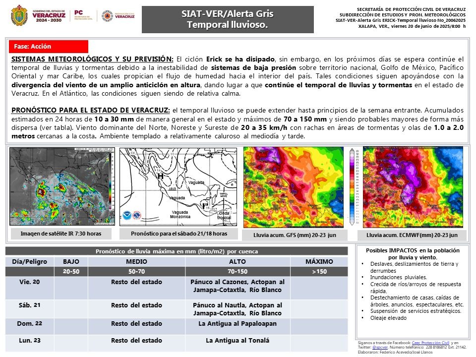 El ciclón Erick se ha disipado; sin embargo, en los próximos días se espera que continúe el temporal de lluvias y tormentas debido a la inestabilidad de sistemas de baja presión sobre territorio nacional, Golfo de México, Pacífico Oriental y mar Caribe, los cuales propician el flujo de humedad hacia el interior del país. Tales condiciones siguen apoyándose con la divergencia del viento de un amplio anticiclón en altura, dando lugar a que continúe el temporal de lluvias y tormentas en el estado de Veracruz. En el Atlántico, las condiciones siguen siendo de relativa calma.