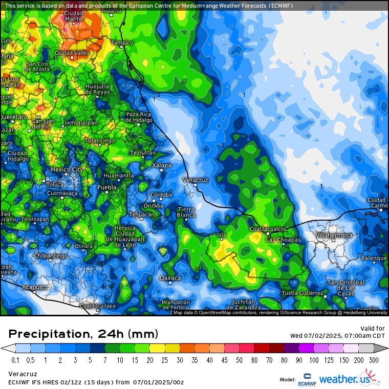 En los próximos días se espera que continúe dominando la inestabilidad de sistemas de baja presión sobre territorio nacional, Golfo de México, Pacífico Oriental y mar Caribe, entre ellos el huracán Flossie, con centro localizado esta mañana a 250 km al Sursuroeste de Manzanillo. Tales sistemas seguirán aportando humedad al territorio nacional y apoyándose con la divergencia del viento en altura para mantener el potencial de lluvias y tormentas en gran parte del país, incluido el estado de Veracruz, donde se espera disminuya en los siguientes días.