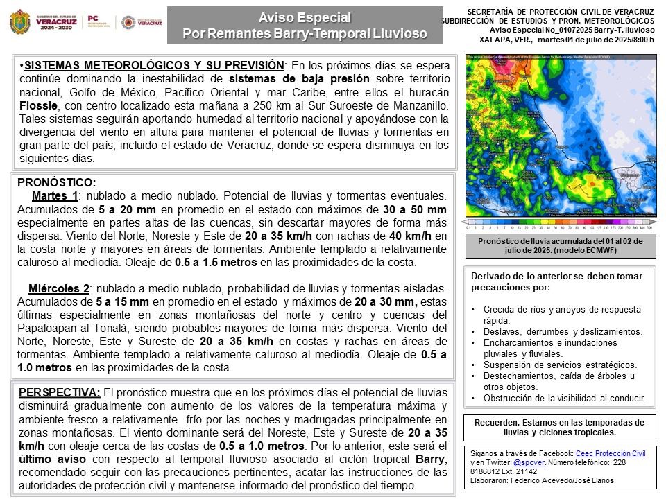 El pronóstico muestra que en los próximos días el potencial de lluvias disminuirá gradualmente con aumento de los valores de la temperatura máxima y ambiente fresco a relativamente frío por las noches y madrugadas, principalmente en zonas montañosas. El viento dominante será del noreste, este y sureste de 20 a 35 km/h con oleaje cerca de las costas de 0.5 a 1.0 metros. Por lo anterior, este será el último aviso con respecto al temporal lluvioso asociado al ciclón tropical Barry, recomendado seguir con las precauciones pertinentes, acatar las instrucciones de las autoridades de protección civil y mantenerse informado del pronóstico del tiempo.