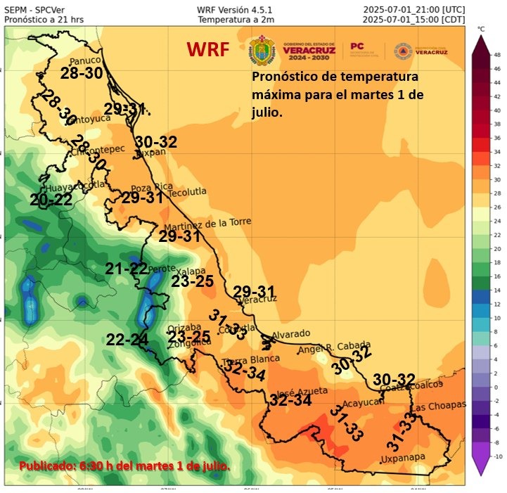 Miércoles 2: nublado a medio nublado, probabilidad de lluvias y tormentas aisladas. Acumulados de 5 a 15 mm en promedio en el estado y máximos de 20 a 30 mm, estas últimas especialmente en zonas montañosas del norte y centro y cuencas del Papaloapan al Tonalá, siendo probables mayores de forma más dispersa. Viento del Norte, Noreste, Este y Sureste de 20 a 35 km/h en costas y rachas en áreas de tormentas. Ambiente templado a relativamente caluroso al mediodía. Oleaje de 0.5 a 1.0 metros en las proximidades de la costa.