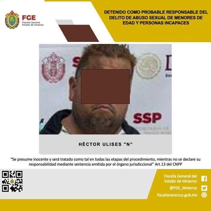 Boca del Río, Ver -La Fiscalía General del Estado informa que, elementos de la Policía Ministerial cumplimentaron en este municipio, una orden de aprehensión en contra de Héctor Ulises «N” como probable responsable del delito de abuso sexual de menores de edad y personas incapaces, cometido en agravio de una víctima adolescente de identidad resguardada.