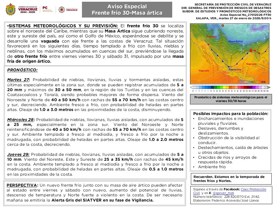 Actualmente nos encontramos en el periodo de mayor llegada de sistemas frontales al país. Estos sistemas contribuyen a la presencia de lloviznas, lluvias, nieblas, neblinas, eventos de “Norte” y descensos marcados de temperatura, que en ocasiones pueden provocar heladas. En promedio, durante la temporada se registran alrededor de 50 frentes fríos, de los cuales aproximadamente 30 cruzan Veracruz.