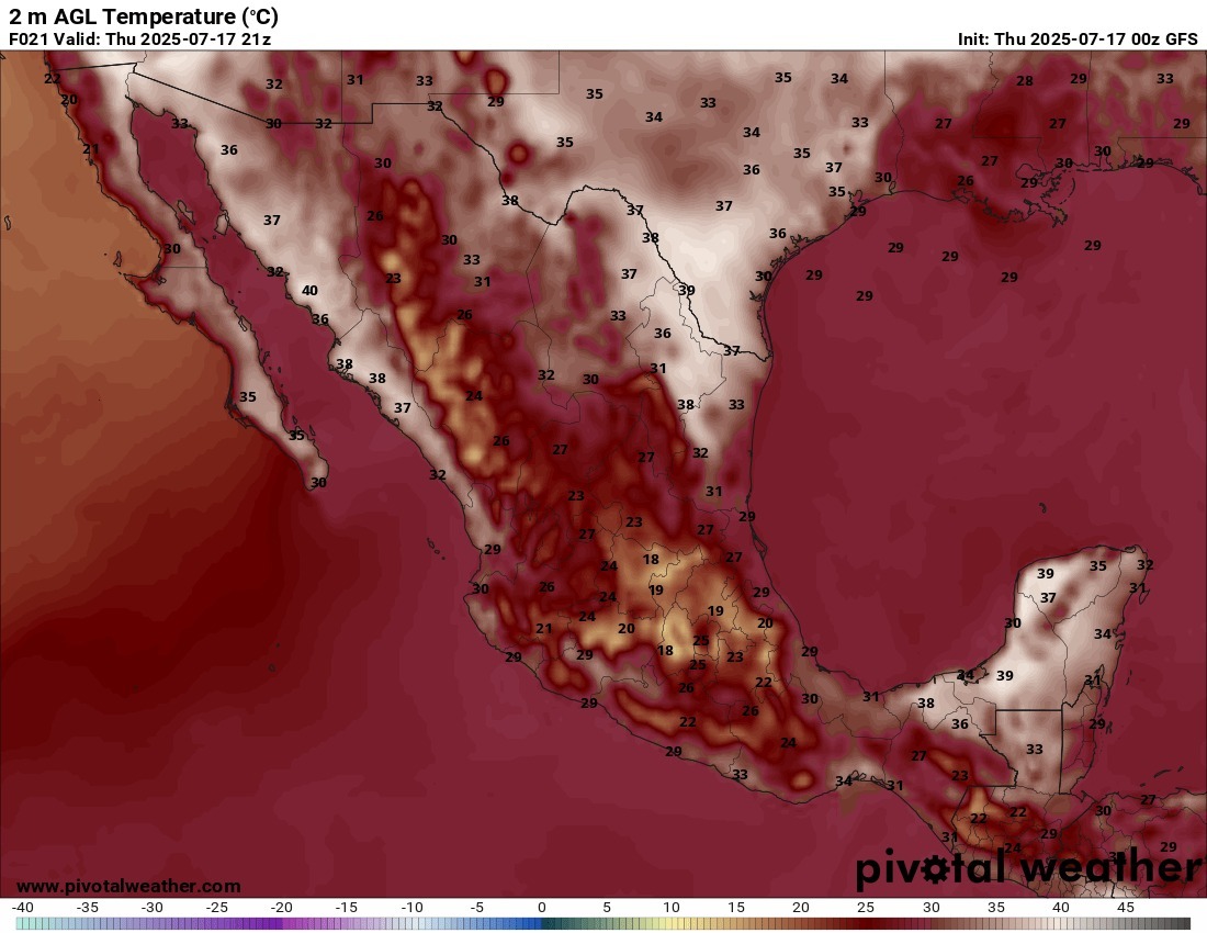 En las siguientes 24 horas continuarán las lluvias gran parte del país, excepto en amplias regiones del noroeste, noreste y sureste, donde la probabilidad será baja o nula, esperándose los acumulados mayores en Sinaloa, Chihuahua, Durango, suroeste de Zacatecas, Nayarit, Jalisco, Aguascalientes, Guanajuato, Querétaro, centro y sureste de San Luis Potosí, Estado y Ciudad de México, Tlaxcala, Hidalgo, Morelos, Colima, Michoacán, Guerrero y montañas de Puebla y Veracruz. Mientras tanto, se prevé poco cambio en la temperatura máxima, con los valores más altos en Baja California Sur, oeste de Sonora, norte de Sinaloa, norte de Chihuahua y Coahuila, norte y centro de Nuevo León y Tamaulipas, Tabasco, Campeche, Yucatán y Quintana Roo.