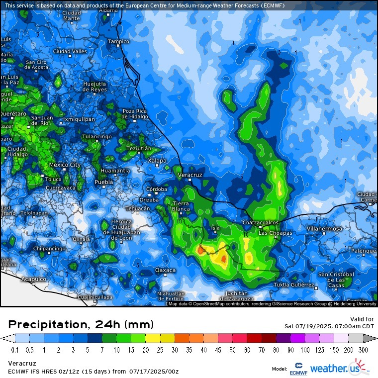 Región Sur (Cuencas del Papaloapan, Coatzacoalcos y Tonalá, incluyendo Los Tuxtlas): medio nublado por la mañana, aumentando los nublados por la tarde-noche y madrugada con probabilidad de lluvias aisladas con algunas tormentas. Acumulados estimados en 24 horas de 5 a 15 mm con máximos de 20 a 30 mm. Posibles nieblas eventuales esta noche a madrugada. Viento del Norte y Noreste de 20 a 30 km/h con rachas de 40 km/h en la costa. Ambiente caluroso al mediodía y templado por la noche y madrugada. Tmáx. 34 a 36°C en llanuras y de 32 a 34°C en costa. Tmín. 24 a 27°C (Menores en la región de los Tuxtlas).