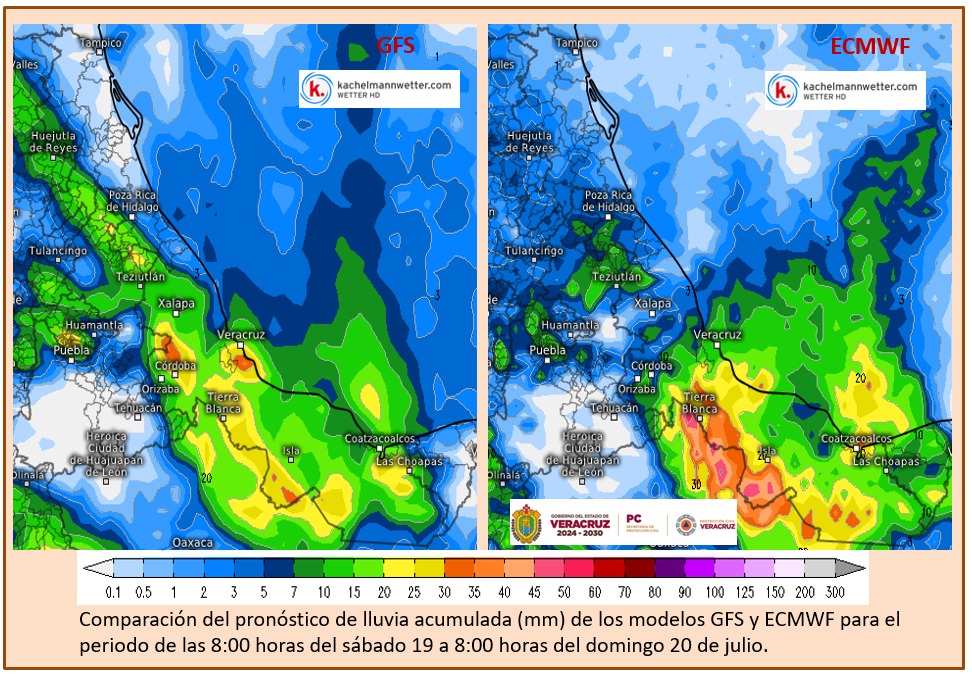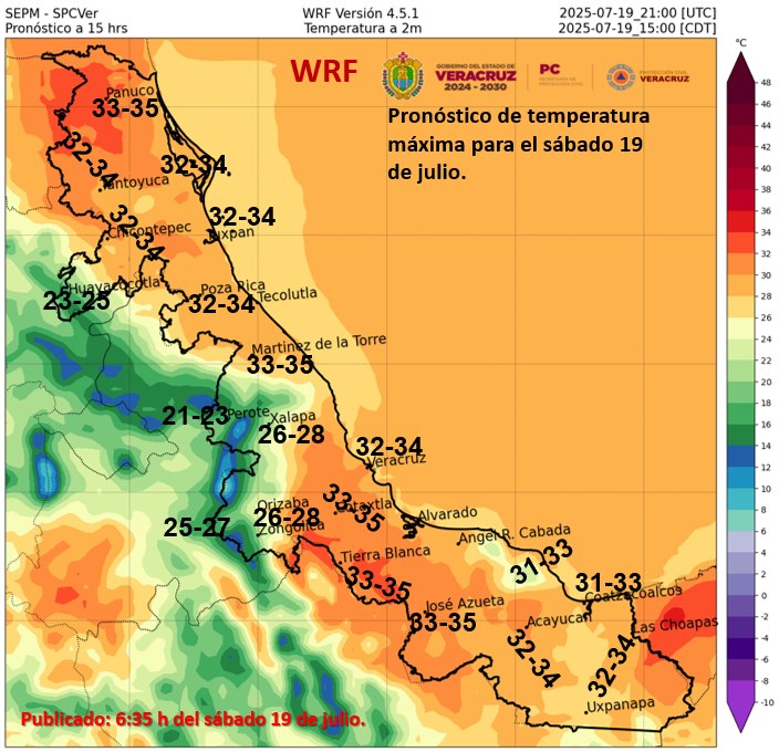 Xalapa, Ver., sábado 19 de julio de 2025.– En las próximas 24 horas se mantendrá ambiente caluroso al mediodía y primeras horas de la tarde con probabilidad de lluvias aisladas y algunas tormentas, los acumulados más altos se esperan en regiones montañosas y la zona sur. El viento dominante será del Norte, Noreste, Este y Sureste de 20 a 35 km/h en la costa y rachas en zonas de tormenta. Se recomienda continuar con las precauciones y seguir las recomendaciones de las autoridades de protección civil.