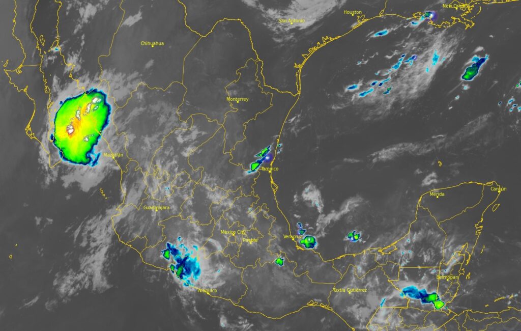 En las siguientes 24 horas continuarán las lluvias gran parte del país, excepto en amplias regiones del noroeste, norte, noreste y sureste, donde la probabilidad será baja o nula, mientras que los acumulados mayores se esperan sobre la Sierra Madre Occidental, Sinaloa, Durango, Zacatecas, Nayarit, Jalisco, Aguascalientes, Guanajuato, sureste de San Luis Potosí, Estado y Ciudad de México, Tlaxcala, Hidalgo, Morelos, Colima, norte de Puebla, Michoacán, Guerrero y Oaxaca, montañas y sur de Veracruz y este de Chiapas. Por otra parte, se prevé un gradual aumento de los valores de la temperatura máxima, con los valores más altos en Baja California Sur, oeste y sur de Sonora, norte de Sinaloa, norte de Chihuahua y Coahuila, norte y centro de Nuevo León y Tamaulipas, Tabasco, Campeche, Yucatán y Quintana Roo.