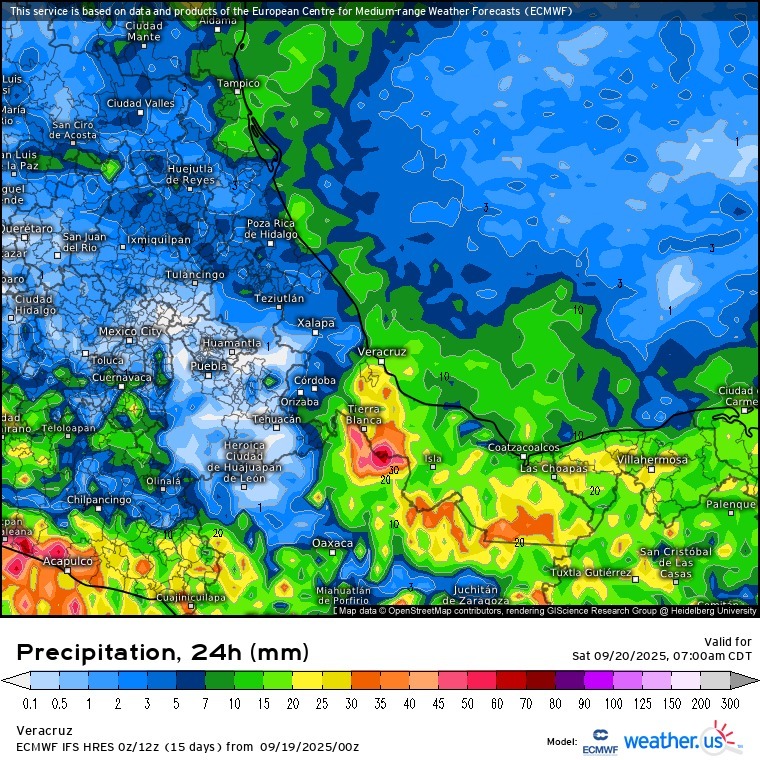 De acuerdo con los modelos de pronóstico, para los próximos siete días en el estado de Veracruz se prevé una temperatura media dentro o ligeramente superior a la climatología, así como lluvias acumuladas mayores al promedio principalmente del centro al sur.
