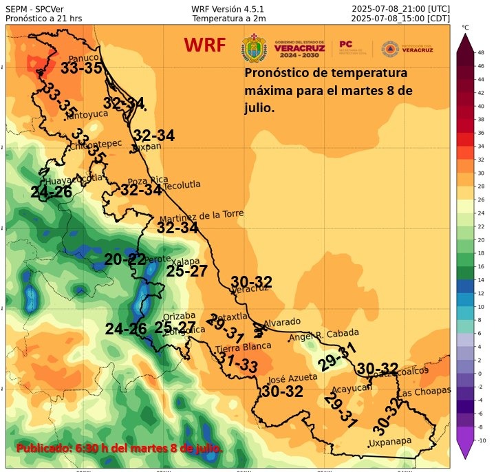 En las próximas 24 horas se prevé que las lluvias de intensidad moderada a ocasionalmente fuerte se generalicen en el estado de Veracruz, asimismo los valores de la temperatura máxima disminuyen ligeramente especialmente en las zonas norte y centro. El viento dominante será del Norte, Noreste y Este de 20 a 35 km/h con rachas en áreas de tormentas. Se recomienda continuar con las precauciones y seguir las recomendaciones de las autoridades de protección civil.