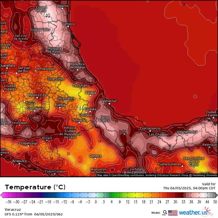 Regiones montañosas del centro: Despejado a medio nublado por la mañana; los nublados y la probabilidad de lluvias acompañadas por algunas tormentas aumentan por la tarde-noche. Acumulados en 24 horas de 5 a 15 mm con máximos de 20 a 30 mm y siendo probables mayores de forma más dispersa. Viento del Noreste, Este y Sureste de 15 a 25 km/h con rachas de 40 km/h en el valle de Perote y mayores en áreas de tormentas. Ambiente caluroso al mediodía y primeras horas de la tarde, fresco a relativamente frío por la noche y madrugada. Tmáx/Tmín. 28 a 30°C/15 a 18°C (menores en el valle de Perote).