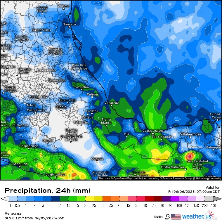 Región Sur (Cuencas del Papaloapan, Coatzacoalcos y Tonalá, incluyendo Los Tuxtlas): nublado a medio nublado, probabilidad de lluvias aisladas con algunas tormentas generalmente por la tarde-noche y madrugada. Acumulados estimados en 24 horas de 5 a 20 mm con máximos de 20 a 50 mm, sin descartar mayores. Viento del norte y noreste de 20 a 35 km/h. Ambiente caluroso al mediodía y primeras horas de la tarde, templado por la noche y madrugada. Tmáx. 36 a 38°C en llanuras y de 33 a 35°C en costa. Tmín. 23 a 26°C (menores en la región de los Tuxtlas).