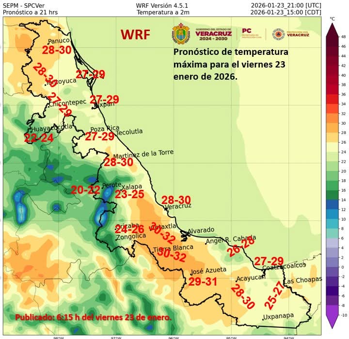 Xalapa, Ver., viernes 23 de enero de 2026.- Entre este viernes y la tarde del domingo existirán condiciones limitadas para lluvias en la entidad, mientras que los valores de la temperatura máxima mostrarán un aumento gradual. No obstante, persistirá ambiente fresco a frío durante la noche y madrugada, con probabilidad de heladas en zonas altas. El viento será del Noreste, Este y Sureste de 20 a 35 km/h, y se espera una Surada moderada a fuerte en las regiones típicas del estado entre el sábado y la tarde del domingo.