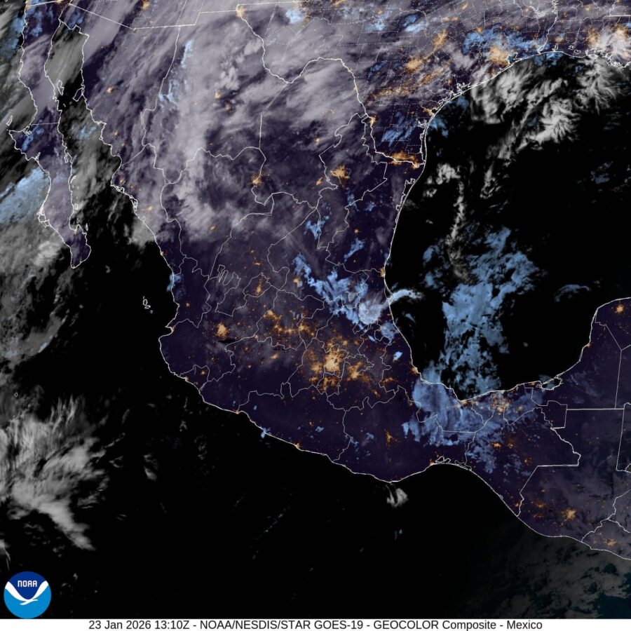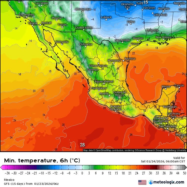 En relación con las temperaturas mínimas, se prevé poco cambio en entidades de la Mesa del Norte, Mesa Central y localidades serranas del país, donde continuará el ambiente muy frío a frío durante la noche y madrugada; asimismo, persistirá el potencial de heladas al amanecer en terrenos de mayor elevación. Los registros más bajos se esperan en el norte de Baja California, noreste y oriente de Sonora, sierras de Chihuahua, Durango, Zacatecas, Coahuila y Nuevo León; además, se prevén valores bajos en Aguascalientes, Guanajuato, centro y oriente de Jalisco, norte de Michoacán, Querétaro, Estado y Ciudad de México, Tlaxcala, oeste de San Luis Potosí, Hidalgo, Puebla, la región montañosa central de Veracruz, norte y centro de Oaxaca, así como la región central de Chiapas. A partir del próximo domingo y lunes, debido a la invasión de aire frío, se prevé un notable descenso de temperatura en estados del norte, noreste, oriente y centro del país, asociado con la masa ártica que impulsará al frente No. 30.