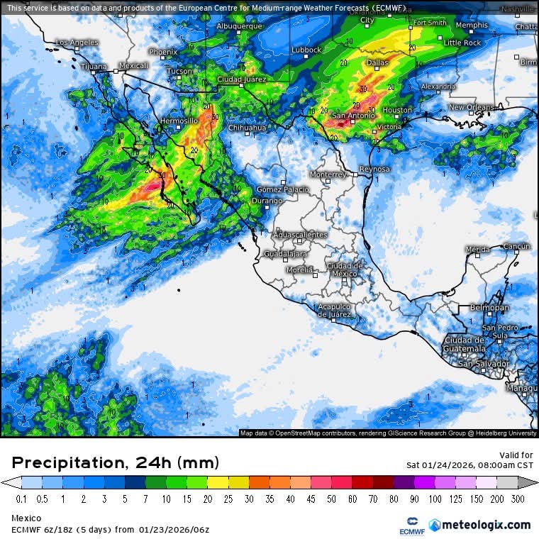 En las próximas 24 horas aumentará notablemente el potencial de lluvias en los estados del noroeste y norte, debido al fuerte aporte de humedad desde capas bajas hasta capas medias, derivado de la interacción de la baja segregada frente a la costa de Baja California con el pulso de la corriente en chorro. Se esperan lluvias moderadas a muy fuertes en Baja California, Baja California Sur, noreste, oriente, centro y sur de Sonora, norte y centro de Sinaloa, norte de Nayarit, norte y occidente de Chihuahua, occidente de Durango y norte de Coahuila; mientras que en el resto del país el potencial para lluvias será bajo, con posibilidad de lluvias escasas a ligeras y aisladas. Asimismo, existen condiciones para la caída de nieve o aguanieve en sierras de Sonora, Chihuahua y Durango.