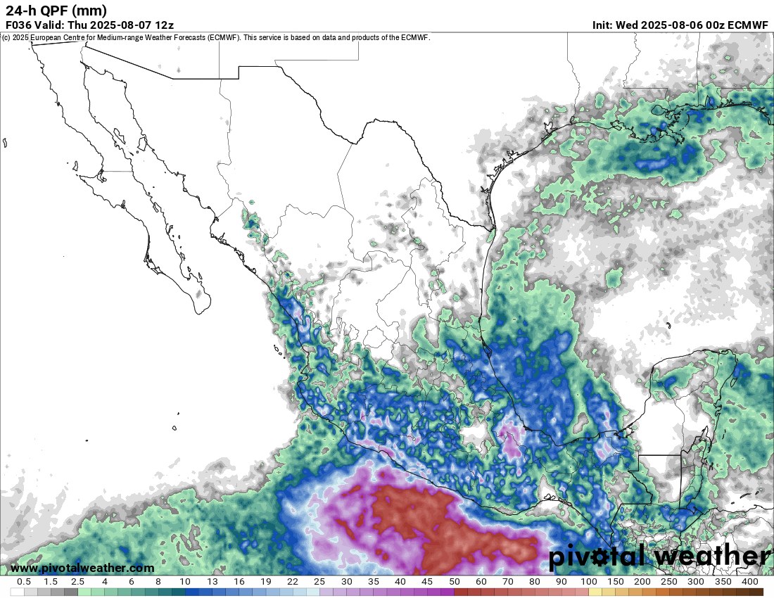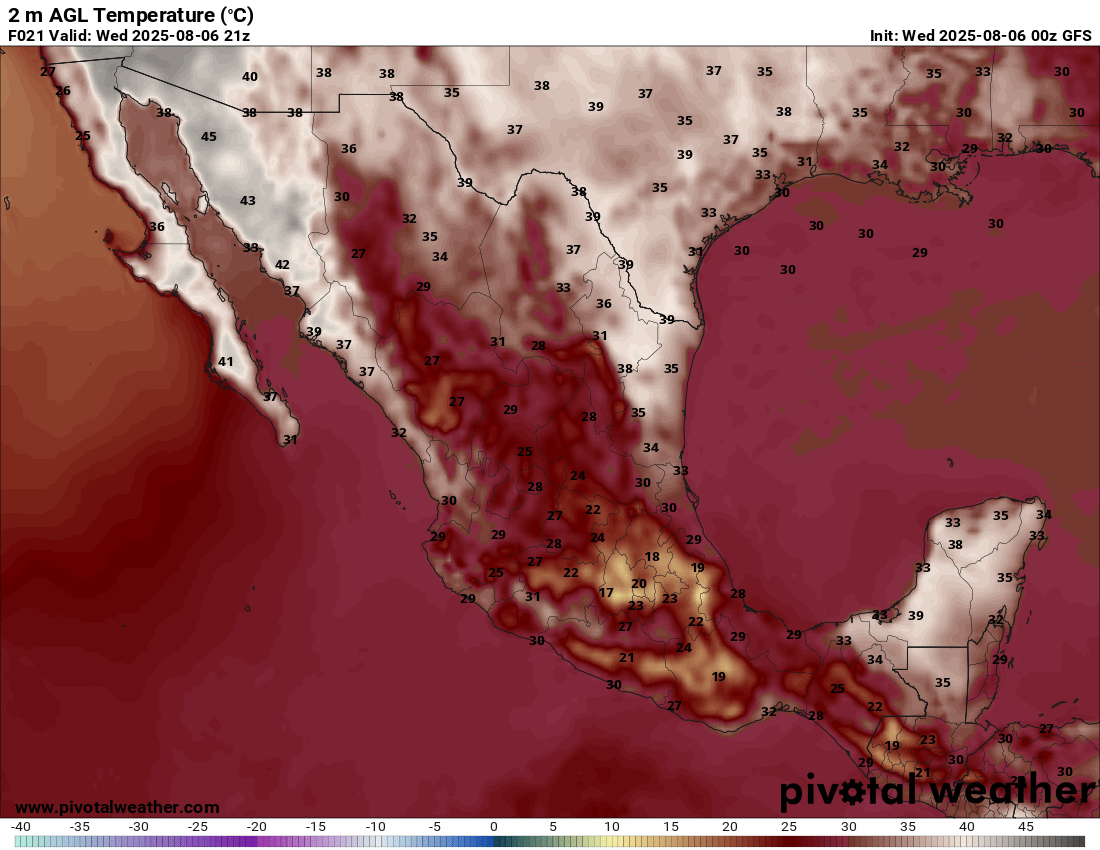 En las siguientes 24 horas, la probabilidad de lluvias y tormentas aumentará en el oeste y sur de México y seguirá en el este y sur, mientras que disminuirá en el sureste, con los acumulados más altos en Nayarit, Jalisco, Colima, Michoacán, Guerrero, Ciudad y Estado de México, Morelos, Veracruz, norte de Puebla, noreste de Hidalgo, Oaxaca, Tabasco y Chiapas. La temperatura máxima aumentará el noroeste y sureste del país, disminuirá ligeramente en el centro y este, y mostrará poco cambio en el resto de las entidades con respecto al día anterior, esperándose los valores más altos en Baja California, Baja California Sur, Sonora, norte de Sinaloa, norte y noreste de Chihuahua, norte de Coahuila, norte y centro de Nuevo León y Tamaulipas, este de Tabasco, Campeche, Yucatán y Quintana Roo. En cuanto a las temperaturas mínimas, se prevé poco cambio con respecto al día anterior, previéndose los valores más bajos en el estado de México, Tlaxcala, sur de Hidalgo y regiones montañosas de Puebla y Veracruz. El viento dominante en el litoral del Golfo de México y el noroeste del Caribe será del Sureste, Este, Noreste y Norte, con velocidades de 20 a 35 km/h y rachas de 55 a 70 km/h, especialmente en costas de Tamaulipas, Tabasco, Campeche y Yucatán. En el litoral del Pacífico el viento continuará del Noroeste, Oeste, Suroeste y Sur de 20 a 35 km/h con rachas de 40 a 55 km/h en costas de la península de Baja California y del Norte con rachas mayores en el Golfo de Tehuantepec. Viento del Sureste con rachas de 45 a 60 km/h es probable en entidades del norte y noreste.