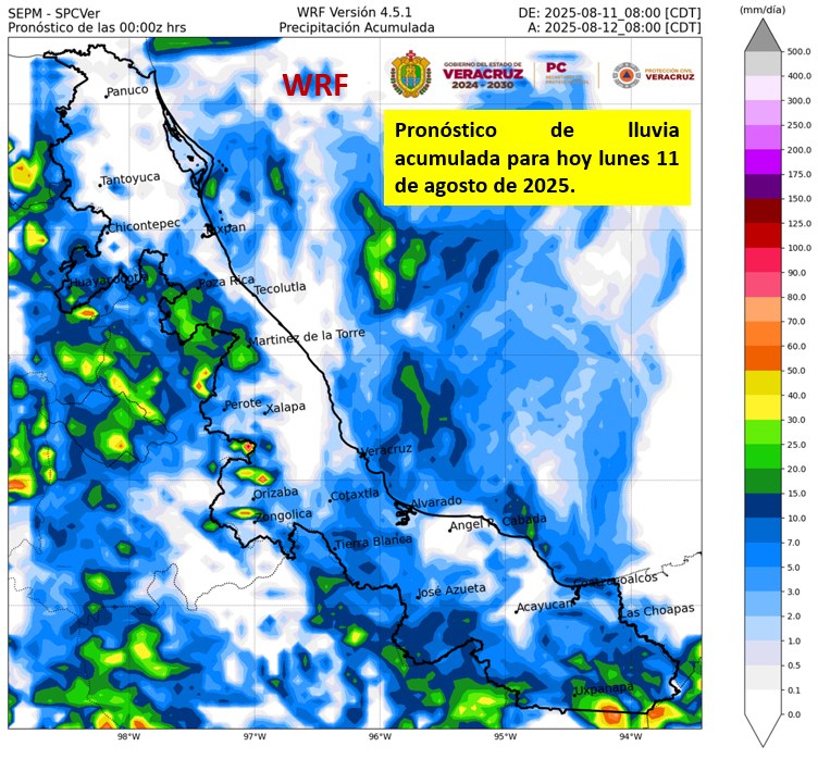Región Sur (Cuencas del Papaloapan, Coatzacoalcos y Tonalá, incluyendo Los Tuxtlas): nublado a medio nublado por la mañana, aumentando la probabilidad de lluvias con tormentas aisladas por la tarde-noche y madrugada. Acumulados estimados en 24 horas de 5 a 20 mm, sin descartar mayores en las partes altas de las cuencas. Viento del norte y noreste de 20 a 35 km/h con rachas en áreas de tormentas. Ambiente caluroso al mediodía y primeras horas de la tarde, templado por la noche a madrugada. Tmáx. 35 a 37°C en llanuras y de 33 a 35°C en costa. Tmín. 24 a 27°C (Menores en la región de los Tuxtlas).