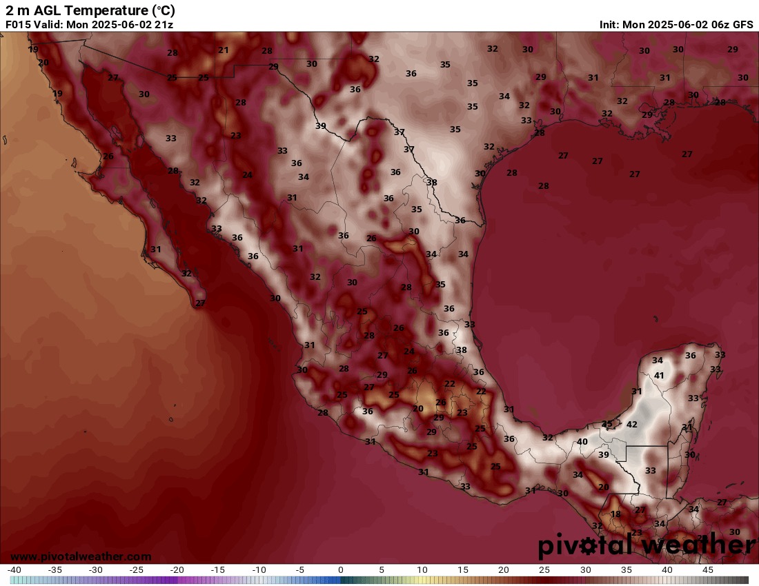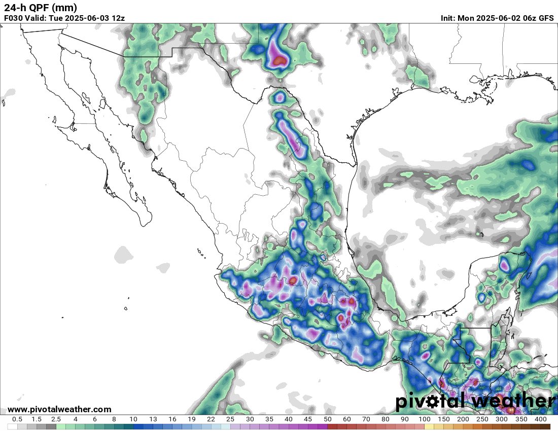 En las siguientes 24 horas se espera potencial de lluvias y tormenta en entidades del noroeste, noreste, oeste, centro, sur y sureste del país, con los máximos acumulados en el este de Sonora, noreste de Coahuila, Nuevo León, oeste de Tamaulipas, San Luis Potosí, Querétaro, Jalisco, Michoacán, Hidalgo, Ciudad de México, Tlaxcala, Estado de México, Puebla, Morelos, Guerrero, Puebla y centro de Veracruz, Oaxaca, Chiapas y noreste de la Península de Yucatán. La temperatura máxima aumenta en el noreste, este y sureste del país, y muestra poco cambio en el resto, con los valores más altos en Sinaloa, Nayarit, oeste de Jalisco, centro de Michoacán, este de Chihuahua, Coahuila, Nuevo León, Tamaulipas, sureste de San Luis Potosí, Veracruz, Tabasco, este de Oaxaca, Tabasco, Campeche, Yucatán y Quintana Roo. Con respecto a las temperaturas mínimas, se espera poco cambio con los valores más bajos en zonas montañosas de Chihuahua y Durango. El viento dominante en el litoral del golfo de México y noroeste del Caribe será del sureste, este, noreste y norte de 20 a 35 km/h con rachas de 45 a 60 km/h en costas de Tamaulipas, norte de Veracruz, Campeche y Yucatán. En los estados del Pacífico se prevé viento del noroeste, oeste y suroeste de 20 a 35 km/h con rachas de 45 a 60 km/h en las costas de la península de Baja California, Sonora, Jalisco, Colima y Michoacán.