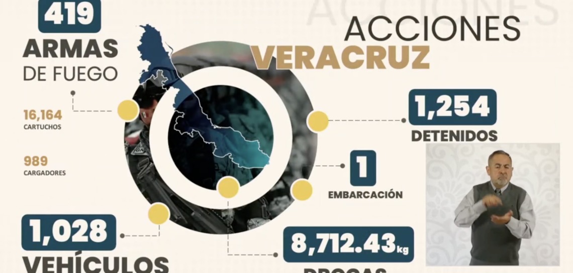 Derivado del reforzamiento de acciones coordinadas en Veracruz, por instrucción de la presidenta Claudia Sheinbaum, se logró la detención de mil 254 personas, el aseguramiento de ocho toneladas de droga, 400 armas de fuego, mil 028 vehículos y una embarcación.