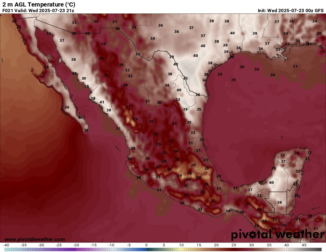 En las siguientes 24 horas se espera que el potencial de lluvias y tormentas esté presente principalmente en entidades del oeste, centro, este, sur y sureste del país, con los acumulados más altos en Colima, Michoacán, estado y ciudad de México, Morelos, Oaxaca, montañas y sur de Veracruz, Chiapas, noreste de Campeche, Yucatán y norte de Quintana Roo. Por otra parte, se prevé poco cambio de la temperatura máxima, con los valores más altos en Baja California Sur, oeste y sur de Sonora, norte de Sinaloa, norte de Coahuila, norte y centro de Nuevo León y Tamaulipas, costas de Oaxaca, Tabasco, Campeche, Yucatán y sur de Quintana Roo. En tanto, las temperaturas mínimas mostrarán poco cambio, con los valores más bajos en regiones del Estado de México, sur de Hidalgo, Tlaxcala y región montañosa de Puebla y Veracruz.