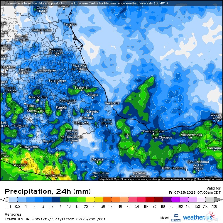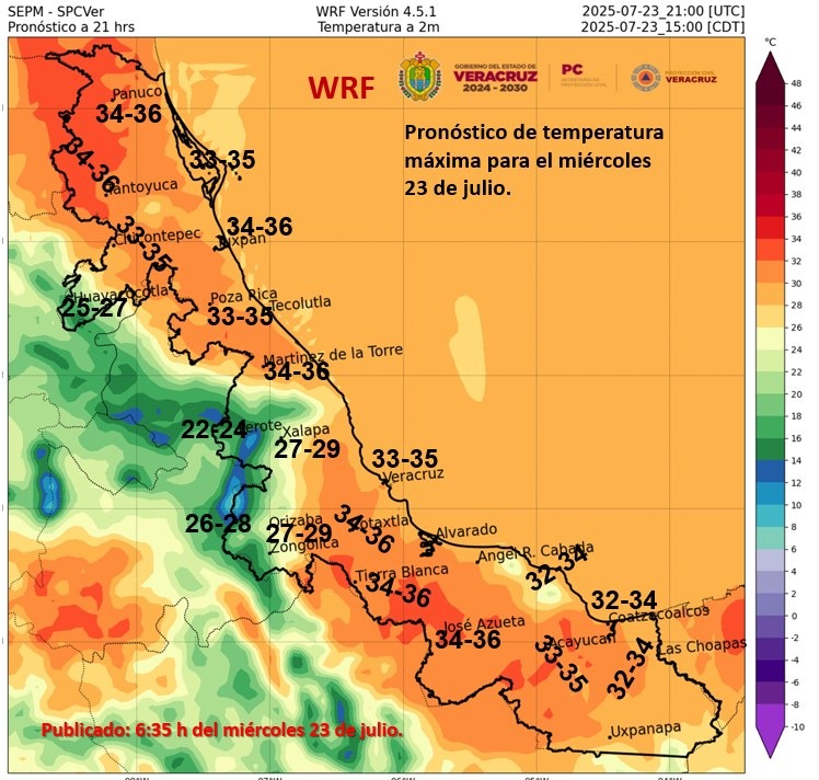 Los modelos de pronóstico resuelven que, en los siguientes siete días en el estado de Veracruz, la temperatura media estará dentro o por arriba de la climatología y la lluvia acumulada por arriba de la media.