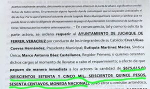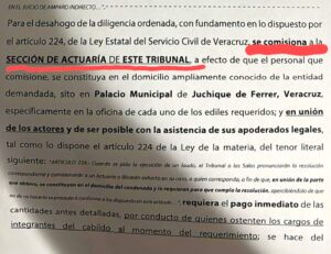 Los afectados señalan que, a tres años del despido injustificado de ocho mujeres y dos hombres sindicalizados, se continúan violentando sus derechos laborales; de estos diez despidos ya existen dos laudos laborales ganados, los cuales ha ignorado el munícipe juchiquense, pues les ha negado el acceso a los actuarios del Tribunal de Conciliación y Arbitraje del Poder Judicial del Estado de Veracruz.