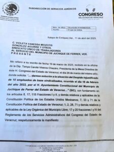 Empleados del municipio de Juchique de Ferrer despedidos en marzo del 2022 solicitan el apoyo del presidente de la Junta de Coordinación Política (JUCOPO) del Congreso de Veracruz, Esteban Bautista Hernández, pues aseguran que el alcalde, Cruz Ulises Cuevas Hernández, se ha negado a recibir las diligencias para su reinstalación.