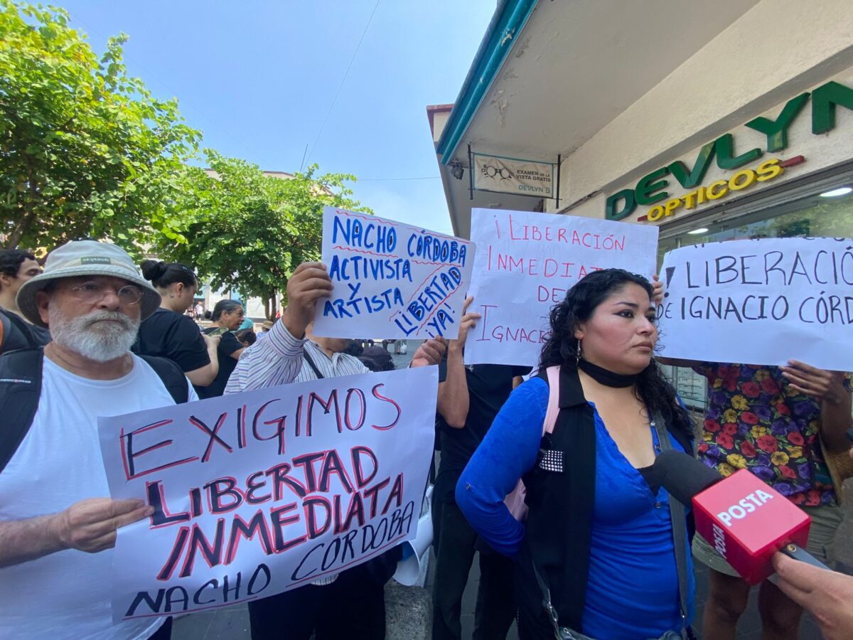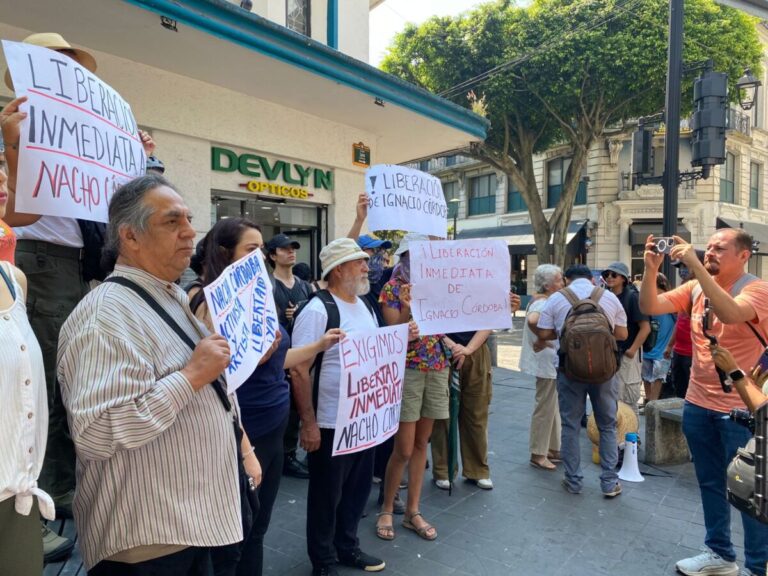 En una protesta en Plaza Lerdo junto a una manifestación de jubilados, la familia del activista Ignacio Córdova y artistas de teatro, de la compañía de la que formó parte, piden la liberación de Ignacio Córdova; lo detuvieron por presuntos estragos al INE y al PRI.