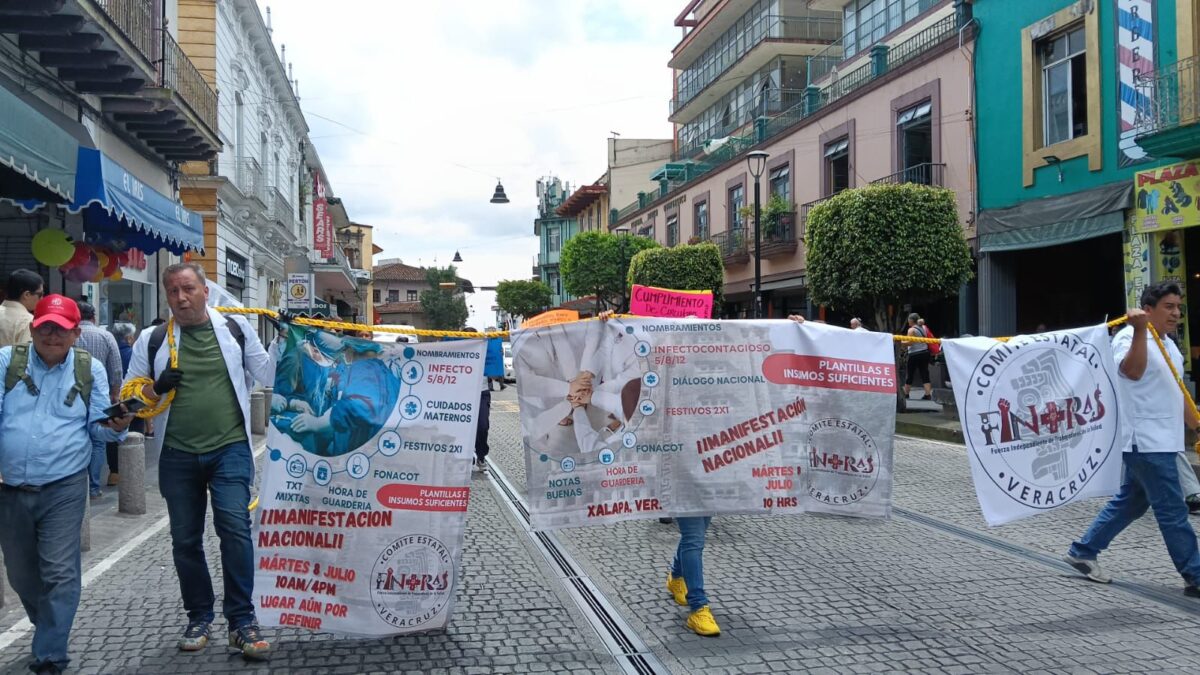 Protestan trabajadores de Salud del IMSS-Bienestar en centro de Xalapa