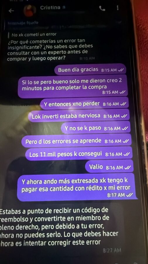 Incluso ella relata que los estafadores le pidieron 16 mil pesos más, por un supuesto concepto de reembolso, pero al no conseguir el dinero, los estafadores dejaron de insistir.