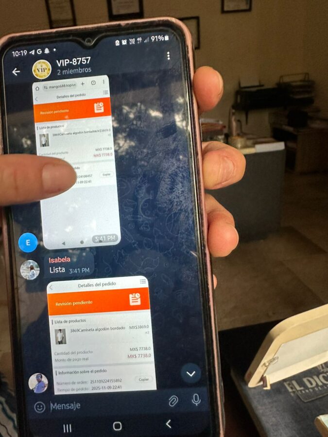 Según narra la afectada, recibió la invitación vía WhatsApp, de parte de una persona identificada, sólo como Santiago, la persona le solicitaba entrar a un grupo de Telegram en donde ella únicamente tendría que mandar capturas de pantalla calificando productos dentro de la aplicación SHEIN , por cada reseña exitosa ella obtenía un depósito de 20 pesos.