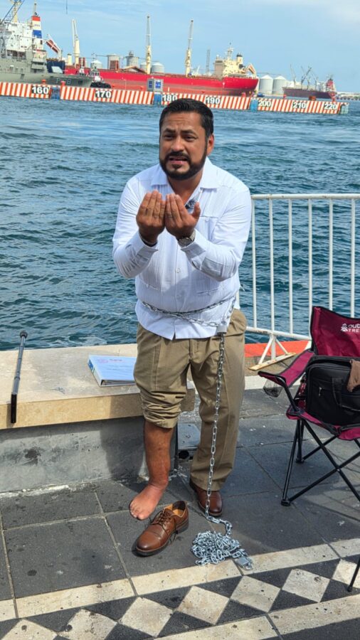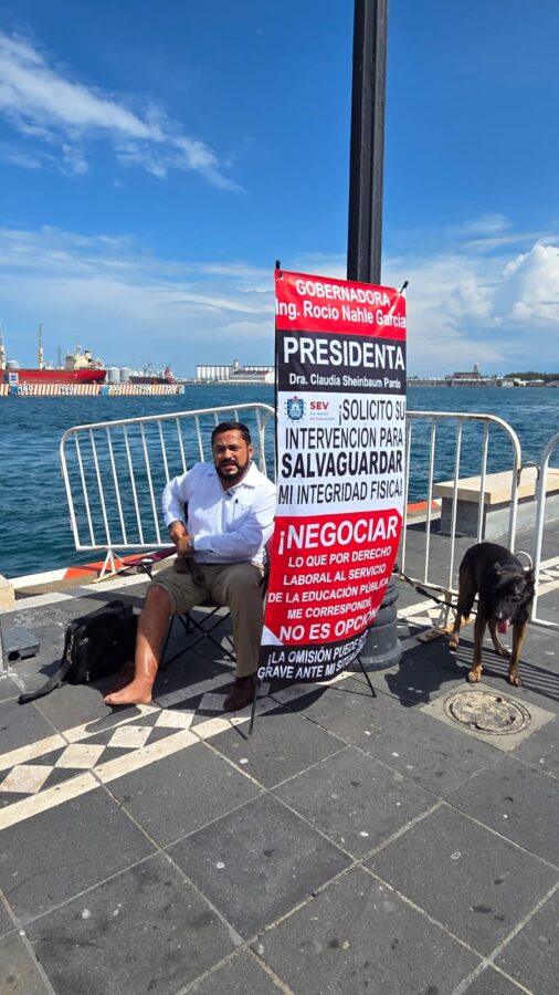 Juan Miguel Ríos Andrade, docente de profesión, se encadenó la mañana de este viernes 3 de octubre al malecón de Veracruz en protesta por la negación de la Secretaría de Educación de Veracruz (SEV) a pagarle más de 2 millones de pesos de seguro de invalidez.