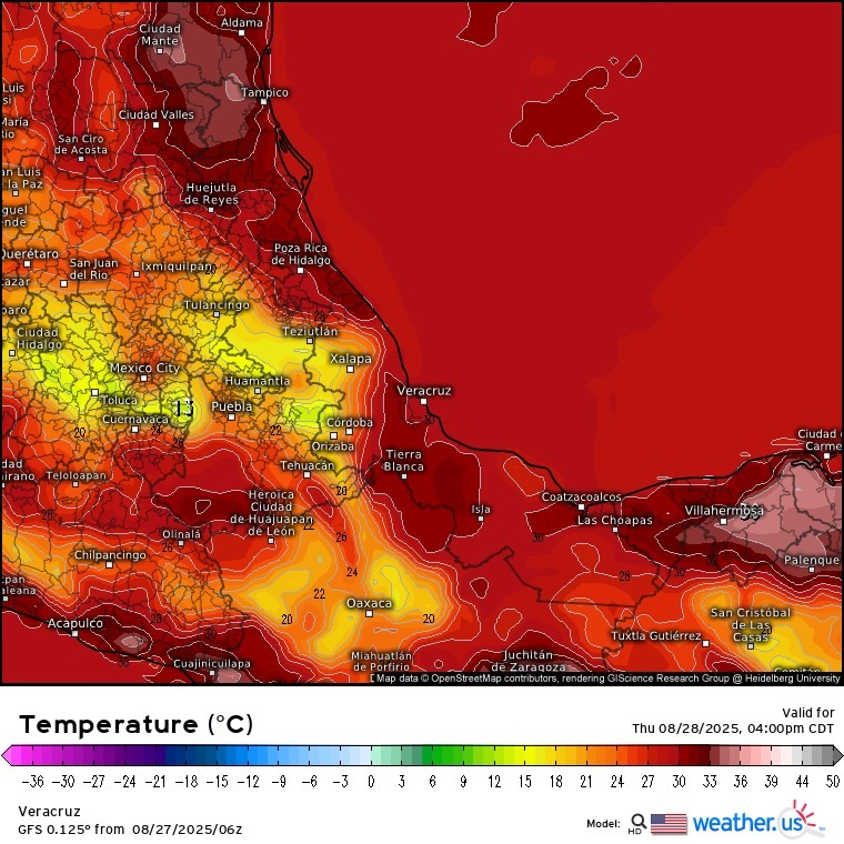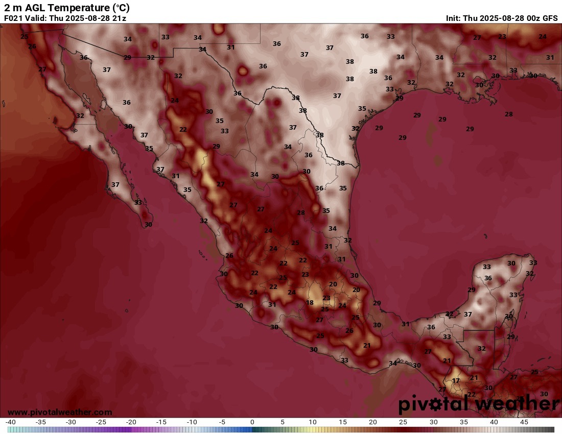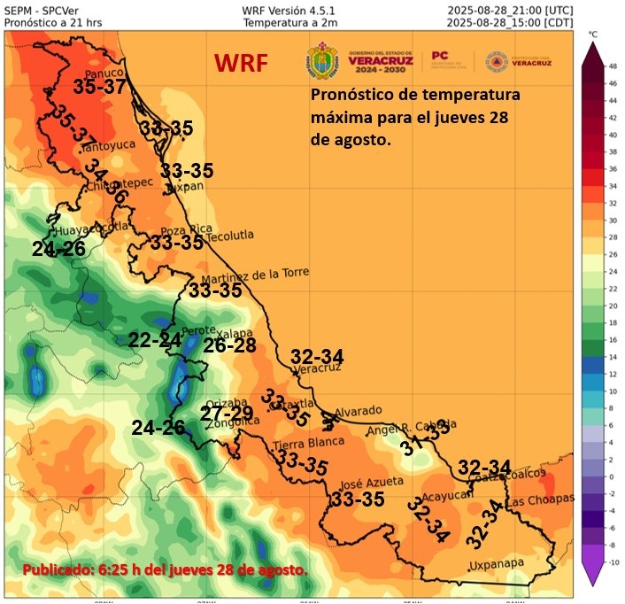 Costa y llanura del centro: medio nublado por la mañana, la probabilidad de lluvias y tormentas aisladas aumenta después del mediodía, pero principalmente por la noche a madrugada. Acumulados en 24 horas de 5 a 15 mm. Nieblas o neblinas eventuales por la madrugada. Viento del noreste de 20 a 35 km/h con rachas en áreas de tormenta. La intensidad del calor aumenta ligeramente en comparación con el día de ayer, ambiente templado por la noche y madrugada. Tmáx. 33 a 35°C en llanura y de 32 a 34°C en costa. Tmín. 23 a 25°C.