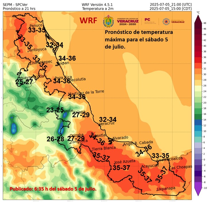 Xalapa, Ver., sábado 5 de julio de 2025.- Se prevé un fin de semana con ambiente caluroso al mediodía y primeras horas de la tarde. Las condiciones para lluvias se mantendrán limitadas durante este sábado, aumentando ligeramente el domingo. Por su parte, el viento dominante será del Sureste, Este y Noreste de 20 a 35 km/h. Se recomienda continuar con las precauciones y seguir las recomendaciones de las autoridades de protección civil.