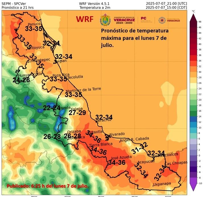 En las próximas 24 horas se prevé que aumenten las condiciones para lluvias con tormentas aisladas, concentrándose los valores más altos en zonas montañosas y porción sur; asimismo, continuará ambiente caluroso al mediodía y primeras horas de la tarde y viento dominante del sureste, este y noreste de 20 a 35 km/h con rachas en áreas de tormentas. Se recomienda continuar con las precauciones y seguir las recomendaciones de las autoridades de protección civil.