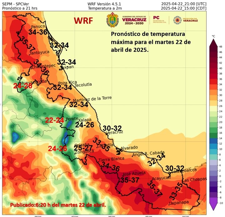 Costa y llanura del centro: disminución de los nublados y la probabilidad de lluvias conforme avance la mañana, medio nublado el resto del día; los nublados aumentan por la noche y principalmente por la madrugada y mañana del miércoles con probabilidad baja de lluvia. Viento dominante del noreste de 20 a 35 km/h. Ambiente caluroso al mediodía y primeras horas de la tarde, templado por la noche y madrugada. Tmáx. 33 a 35°C en llanura y de 30 a 32°C en costa. Tmín. 23 a 25°C.