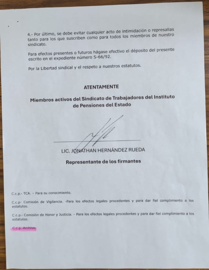 Trabajadores agremiados al Sindicato de Trabajadores del Instituto de Pensiones del Estado (Stipe) solicitaron formalmente mediante oficio al Tribunal de Conciliación y Arbitraje (TCA) frenar lo que califican como un abuso de autoridad por parte del actual Comité Ejecutivo, el cual busca reelegirse por tercer periodo consecutivo sin legalidad alguna, como lo hizo la segunda vez.