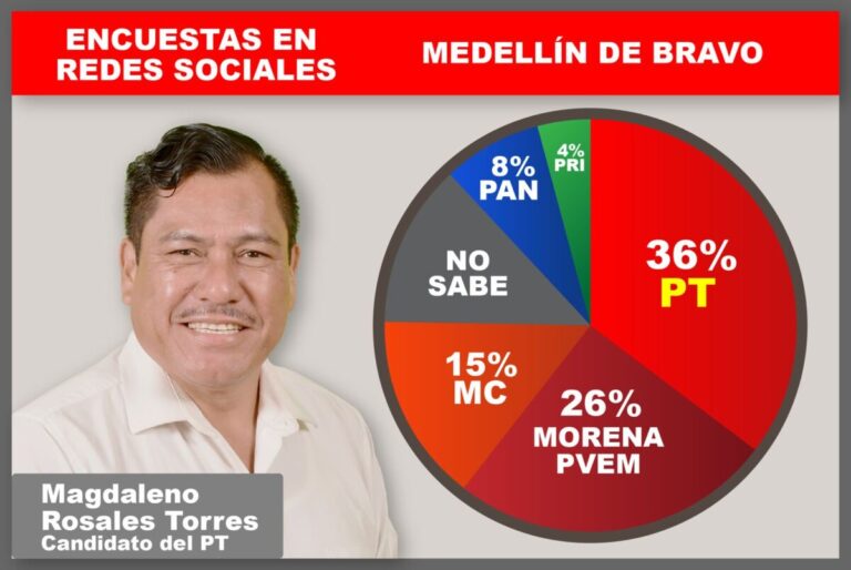 De igual forma, en sondeos abiertos lo ubican con su primera opción para gobernar Medellín de Bravo, por encima de los candidatos de Morena-PVEM, PRI, PAN y Movimiento Ciudadano.