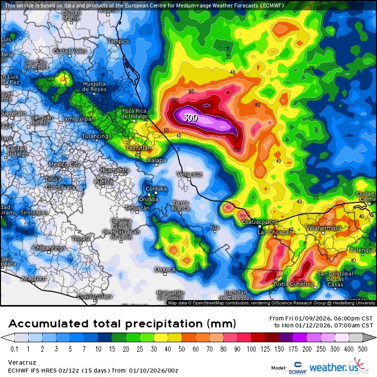 PRONÓSTICO PARA EL ESTADO DE VERACRUZ: Entre hoy sábado 10 y el lunes 12, se prevé aumento del potencial de lluvias y tormentas (actividad eléctrica, ráfagas de viento y en ocasiones torbellinos) fuertes a muy fuertes, con acumulados en 24 horas de 5 a 20 mm y máximos mayores a 150 mm (ver tabla abajo). Existe además la probabilidad de caída de nieve, entre el domingo 11 y lunes 12. En este periodo se establecerá un evento de NORTE con rachas máximas de 95 a 115 km/h en las costas central y de 90 a 105 km/h en las costa norte (consulte tabla), así como de 50 a 70 km/h entre Xalapa-Naolinco-Misantla y valle de Perote. La intensidad del viento disminuirá gradualmente en la costa norte el domingo 11, y en las costas centro y sur el lunes 12, con una probable re-intensificación de menor intensidad el jueves 15. El viento puede desarrollar oleaje de 3.0 a 6.0 metros cerca de costas. Un notable descenso de la temperatura se registraría a partir de hoy sábado 10 y hasta el martes 12, con probabilidad de heladas en zonas altas por las noches y madrugadas del resto de la semana.