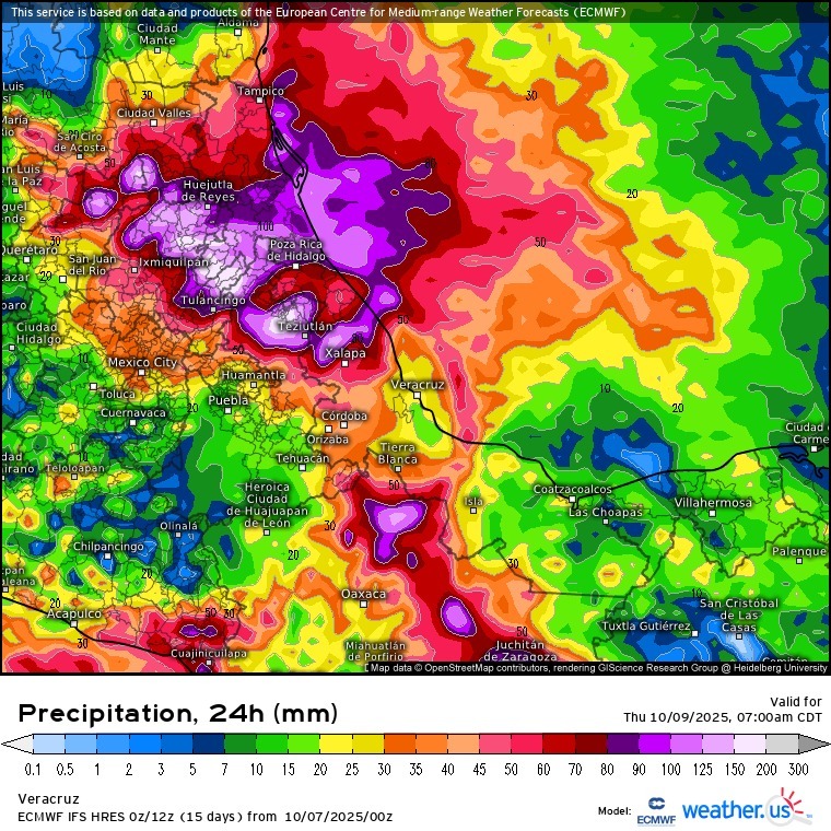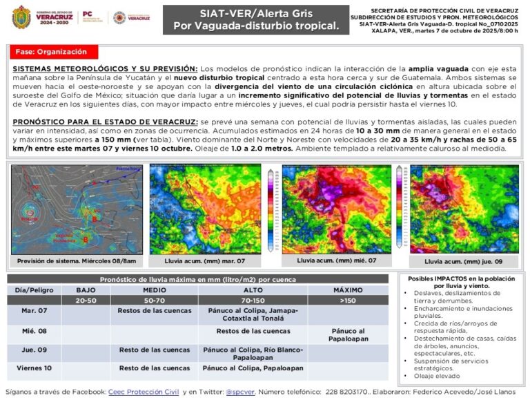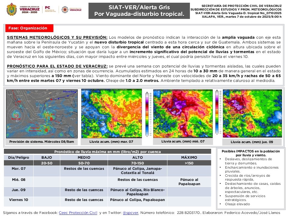 Los modelos de pronóstico indican la interacción de la amplia vaguada con eje esta mañana sobre la Península de Yucatán y el nuevo disturbio tropical centrado a esta hora cerca y al sur de Guatemala. Ambos sistemas se mueven hacia el oeste-noroeste y se apoyan con la divergencia del viento de una circulación ciclónica en altura ubicada sobre el suroeste del Golfo de México; situación que daría lugar a un incremento significativo del potencial de lluvias y tormentas en el estado de Veracruz en los siguientes días, con mayor impacto entre miércoles y jueves, el cual podría persistir hasta el viernes 10.