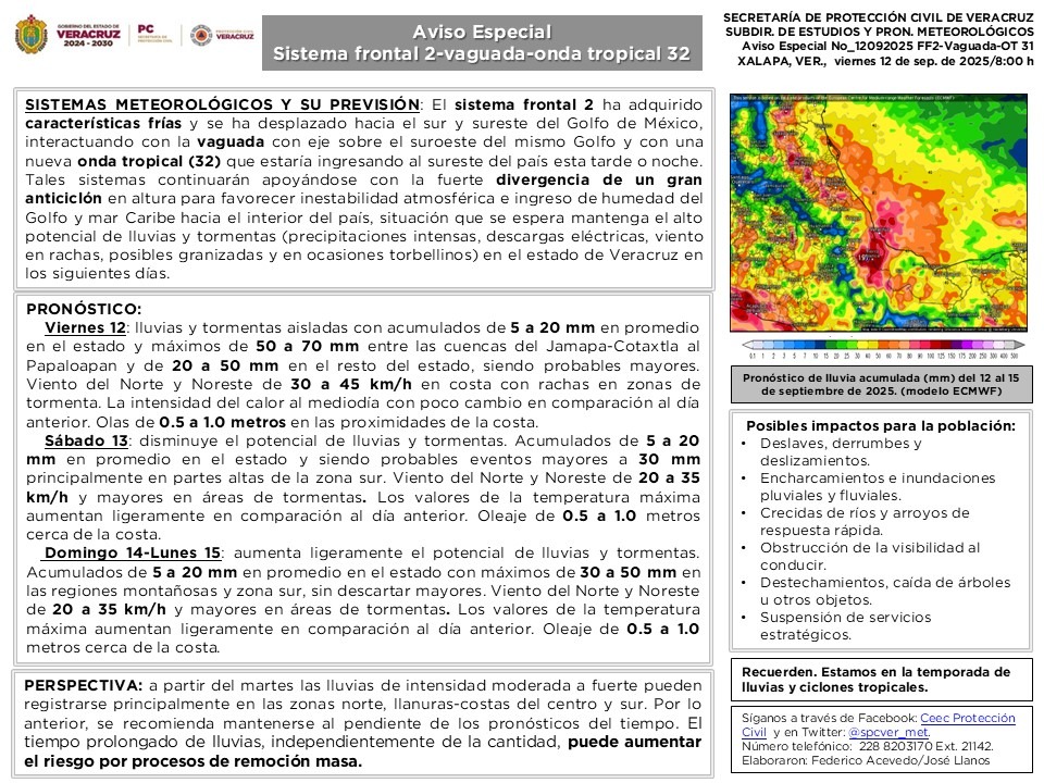 El sistema frontal 2 ha adquirido características frías y se ha desplazado hacia el sur y sureste del Golfo de México, interactuando con la vaguada con eje sobre el suroeste del mismo Golfo y con una nueva onda tropical (32) que estaría ingresando al sureste del país esta tarde o noche. Tales sistemas continuarán apoyándose con la fuerte divergencia de un gran anticiclón en altura para favorecer inestabilidad atmosférica e ingreso de humedad del Golfo y mar Caribe hacia el interior del país, situación que se espera mantenga el alto potencial de lluvias y tormentas (precipitaciones intensas, descargas eléctricas, viento en rachas, posibles granizadas y en ocasiones torbellinos) en el estado de Veracruz en los siguientes días.