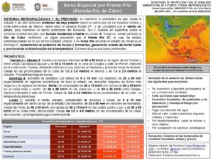 Viernes 4 – Sábado 5: Surada con rachas máximas de 60 a 80 km/h en la región de los Tuxtlas y entre Jesús Carranza-Acayucan y de 55 a 70 km/h en la zona de Orizaba y valle de Perote, menores en la costa norte. Calima. Ambiente caluroso a muy caluroso al mediodía y primeras horas de la tarde. Oleaje en las proximidades de la costa de 1.0 a 3.0 metros el viernes y de 1.0 a 2.0 metros el sábado. Probabilidad baja de lluvias.