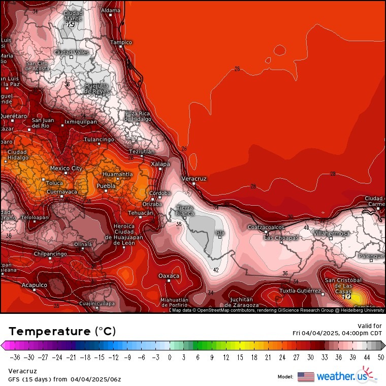 SISTEMAS METEOROLÓGICOS Y SU PREVISIÓN: se mantiene el pronóstico de que, hasta el sábado 5 de abril dominen sistemas de baja presión sobre el centro-sur de los Estados Unidos y norte-centro-este de México -entre ellos el sistema frontal 37-, y se combinen con el viento en altura, para mantener el viento dominante del Suroeste, Sur y Sureste en superficie sobre la vertiente oriental del país con Surada moderada a fuerte en zonas de Veracruz, donde persiste la Ola de Calor. Asimismo, se sigue previendo que el frente frío 37, el cual ha estado semiestacionado en el sur de los Estados Unidos, y su masa fría recorran el estado de Veracruz el domingo 6, aumentando el potencial de lluvias y tormentas, generando evento de Norte fuerte y provocando la disminución de la temperatura. Extreme las precauciones pertinentes.